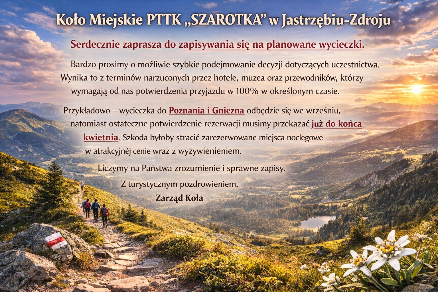 Zapisy przyjmujemy w biurze Oddziału PTTK ul. Harcerska 14 B w Jastrzębiu-Zdroju: we wtorki i w piątki w godz. 16:00-17:30.